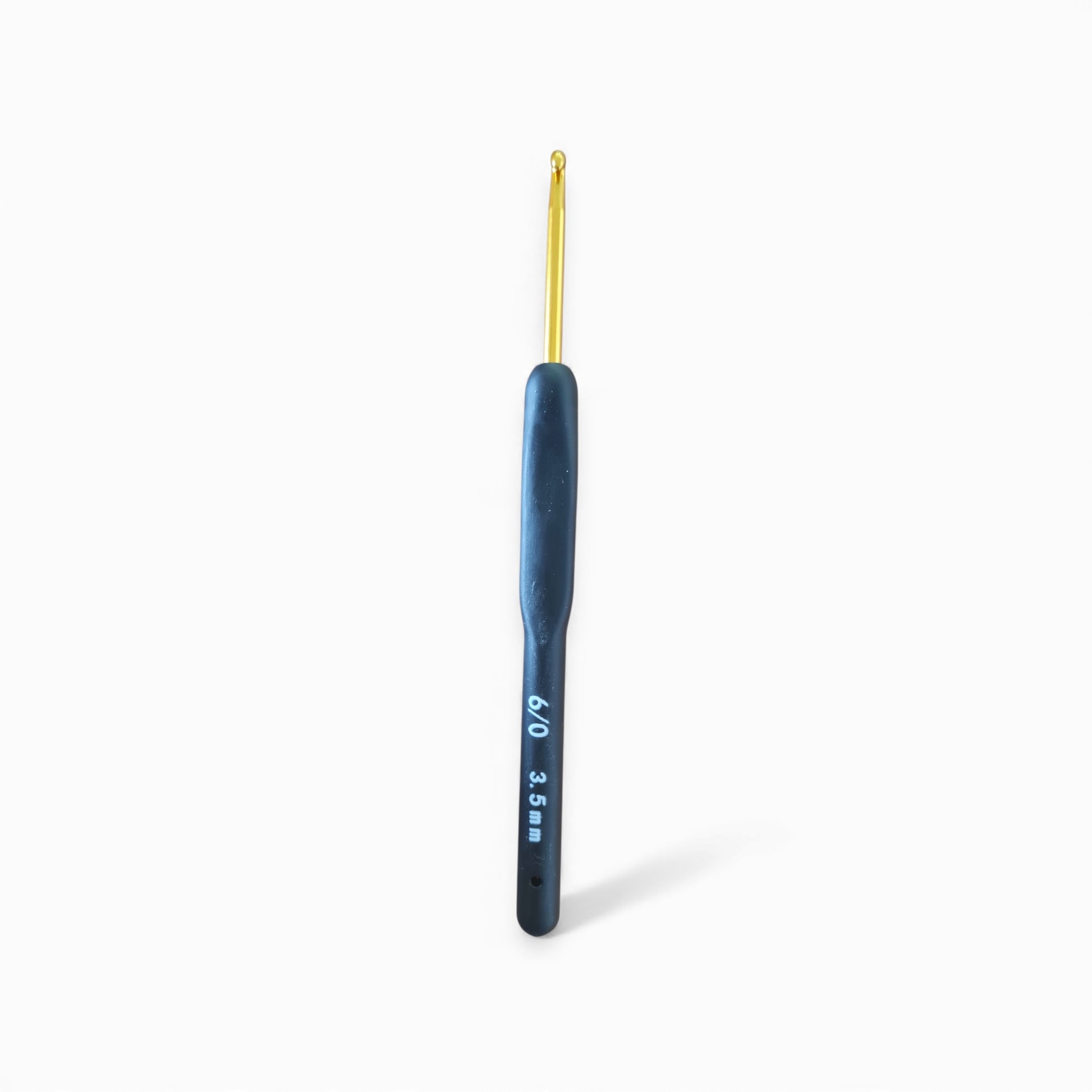 Uncinetto in acciaio dorato con impugnatura in morbido ed ergonomico silicone nero.